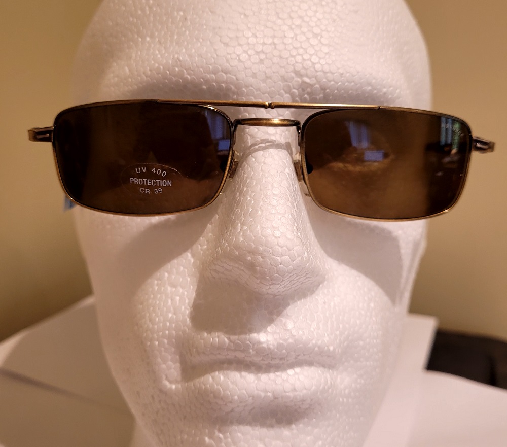 The Phantom, a very popular unisex sunglass frame coated with one micron thickness of Gold and Black Plating with Brown tinted plastic CR39 plano prescription lenses.
